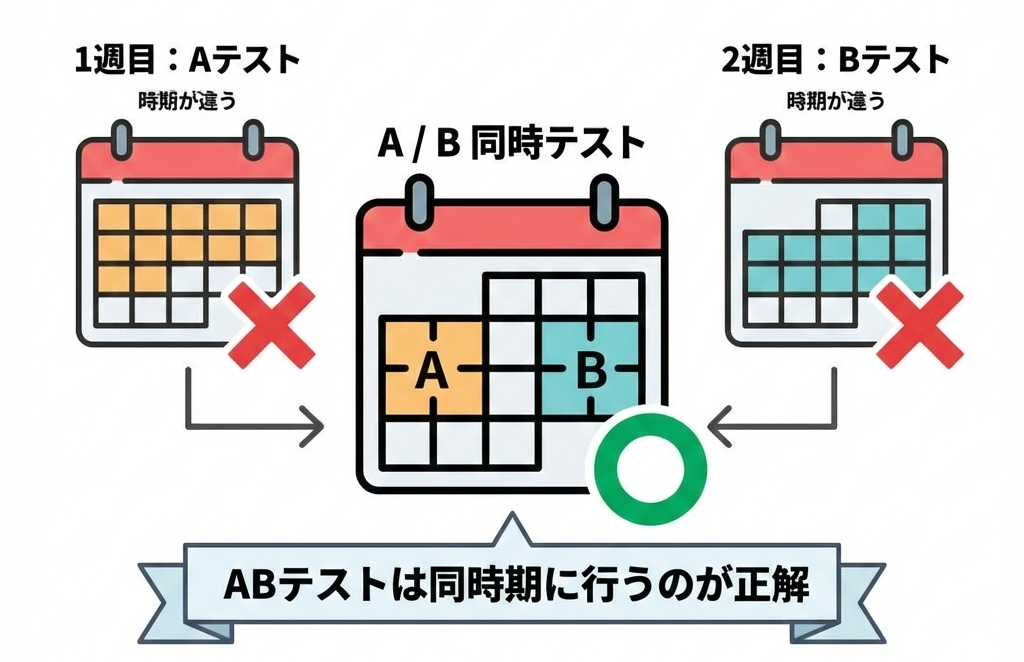 テスト結果が「施策の違い」によるものなのか、「時期の影響」によるものなのか判断できなくなってしまうこともあるんです…